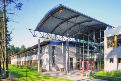 Aufgabe war die Sanierung und die Erweiterung einer im Kiefernwald gelegenen, typischen 60-er Jahre Schule zu einem Schulzentrum der Sekundarstufe 1. Alt- und Neubau werden durch eine zweigeschossige Halle verbunden, an der sich eine mäanderförmige, einbündige Baukörperstruktur anschließt. Damit gelingt es, sowohl den Baumbestand möglichst geringfügig zu belasten, wie auch die räumliche Trennung der Schulhöfe für die Klassen 5 und 6 sowie 7 bis 10 zu gewährleisten. Trotz hoher Transparenz vermittelt der Neubau eine bergende Atmosphäre. Das auskragende Dach der Eingangshalle markiert einladend den neuen Eingang. Der Altbau wurde brandschutz- und wärmetechnisch verbessert und an den Nahtstellen zum Neubau optisch angeglichen.