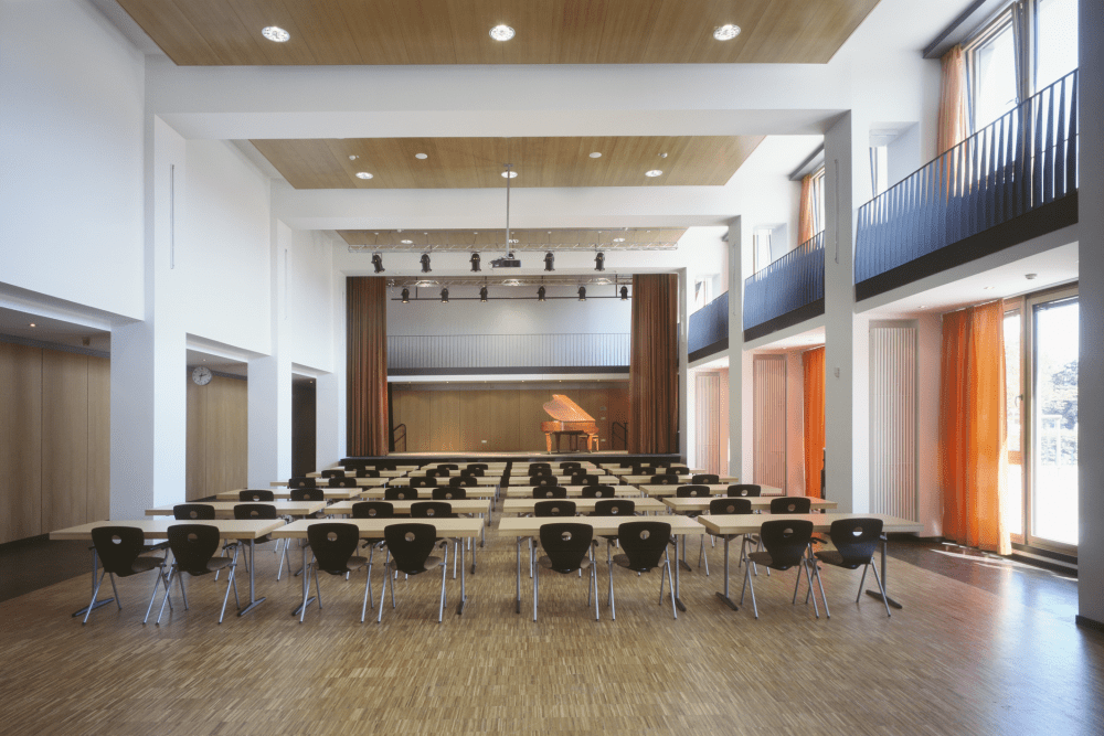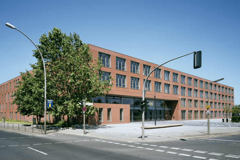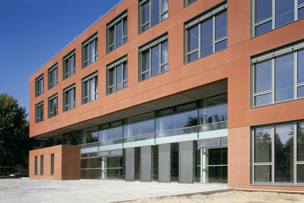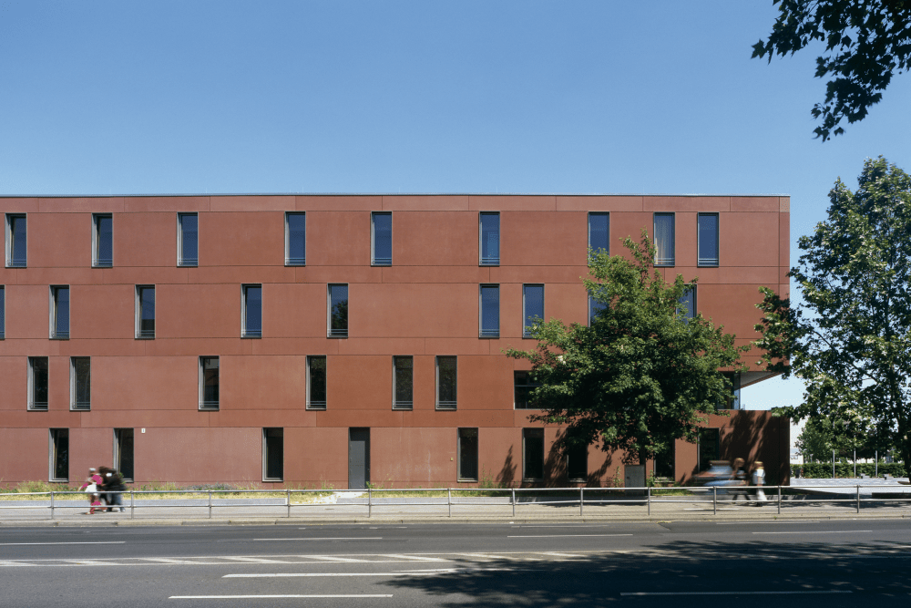Der winkelförmige Neubau der viergeschossigen Otto-Hahn-Schule riegelt das Außengelände mit Schulhof und Sportfeldern zur vielbefahrenen Straße ab. Der Innenhof, das Herz des neuen Baukomplexes, ist Treff- und Orientierungspunkt der Schule. Die sechszügige Sekundarschule mit gymnasialer Oberstufe hat ein sportbetontes Profil, das sich bereits im Eingangsbereich mit einem Vorplatz und Schulhof verbindenden Belag einer 100 m Bahn andeutet. Die Konstruktion besteht aus Stahlbetonfertigelementen, die Fassaden aus rotbraun durchgefärbten und gesäuerten Betonsandwich-Elementen.