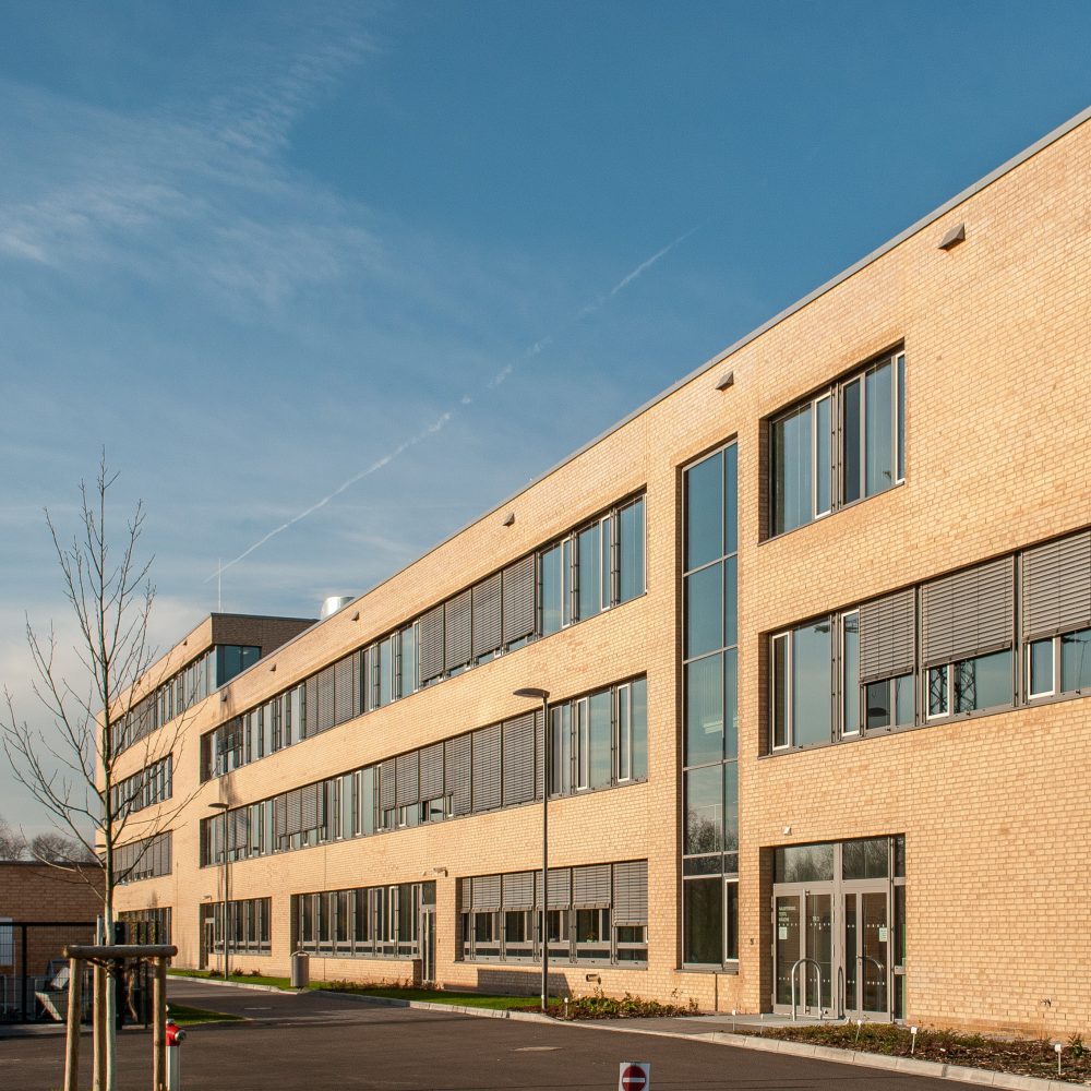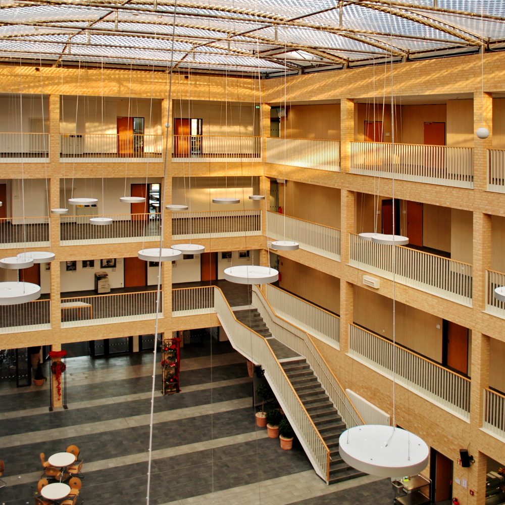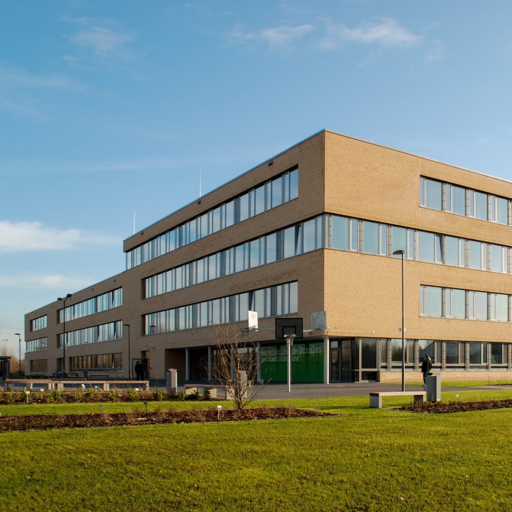 Die Suche nach einer möglichst einfachen Form für ein komplexes Raumprogramm bestimmt das Konzept für den Schulneubau. Das großmaßstäbliche Gebäude ist eindeutig und zugleich respektvoll im weiträumigen Landschaftsraum positioniert. Die Form folgt dem Ziel, für die Schüler einen Ort der Identifikation und Integration zu schaffen, der den Sinn für Gemeinschaft stärkt und gleichzeitig den vielfältigen Schulformen und ihren räumlichen Anforderungen gerecht wird. Der neue Gebäudekomplex für rund 3.200 SchülerInnen beherbergt Unterrichtsräume und Fachräume für Werken, Kunst, Sozialpädagogik, Textil, Krankenpflege, Informatik und Naturwissenschaften. Hinzu kommen drei Hotelküchen, eine Großküche, eine Bäckerei und Konditorei sowie Verwaltungstrakte. Zum Programm gehört auch eine eigene Kinderkrippe, eine Schulhausmeisterwohnung sowie ein Gewächshaus. Durch drei Atrien im Inneren belichtet und strukturiert, erzielt der Bau eine hohe Kompaktheit, die sich sowohl wirtschaftlich als auch energetisch positiv auswirkt. Der mit einem filigranen Foliendach überdachte Innenhof ist gleichzeitig Marktplatz, Kommunikationszentrum und Treffpunkt für die Schule. Er setzt das Thema der Produktionsschule architektonisch um. Die Hausmeisterwohnung und die Kinderkrippe sind in einem separaten Komplex untergebracht.
