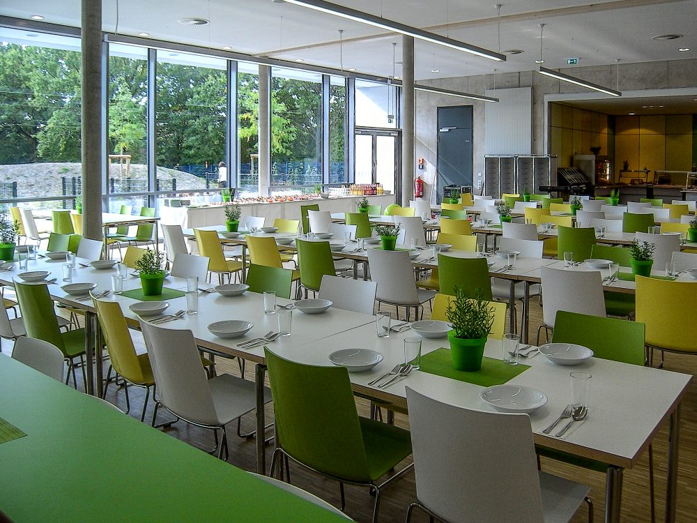 Als erster Baustein für die Erneuerung des Schulzentrums Kreuzheide wurde die Schulmensa für die Sekundarstufen I+II umgesetzt. Der gleich im westlichen Eingangsbereich, an der Franz Marc Straße gelegene Bau, gibt für das ganze Areal einen bislang noch nicht dagewesenen Maßstab und für die Schüler ein komplett neues Raumerleben vor. Als klar und kraftvoll definierte Eingangsgeste erwartet die Schüler und Besucher ein großzügiger, hoher überdachter Vorbereich, der Platz bietet zum Warten, zum sich Treffen, für Kommunikation eben. Sichtbeton dominiert auch den zentralen Eingangs- und Foyerbereich, der sich gemeinschaftlich genutzte Vorzone zwischen beiden Speiseräumen befindet. Dezent in der Wand verkleidet liegen hier hinter hohen Türen die Zugänge zu den WC-Bereichen. Bodentiefe Fenster und verglaste Türen bieten Ein- und Durchblicke in den grünen Außenanlagen und die xx hohen Räume.