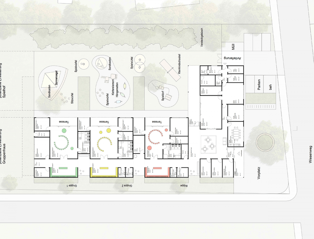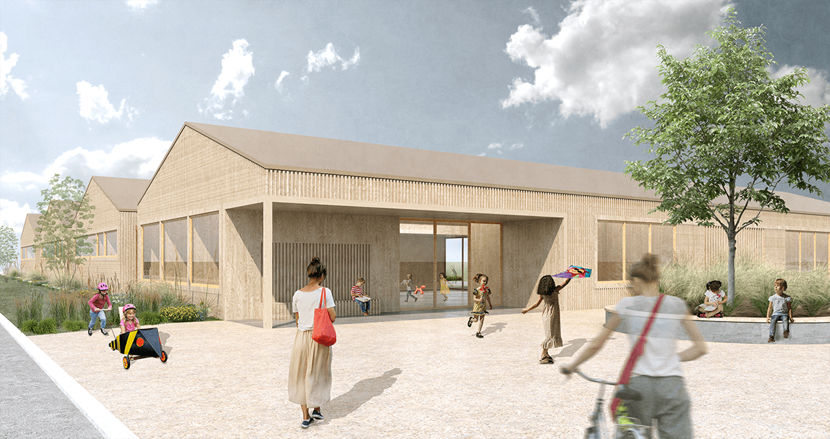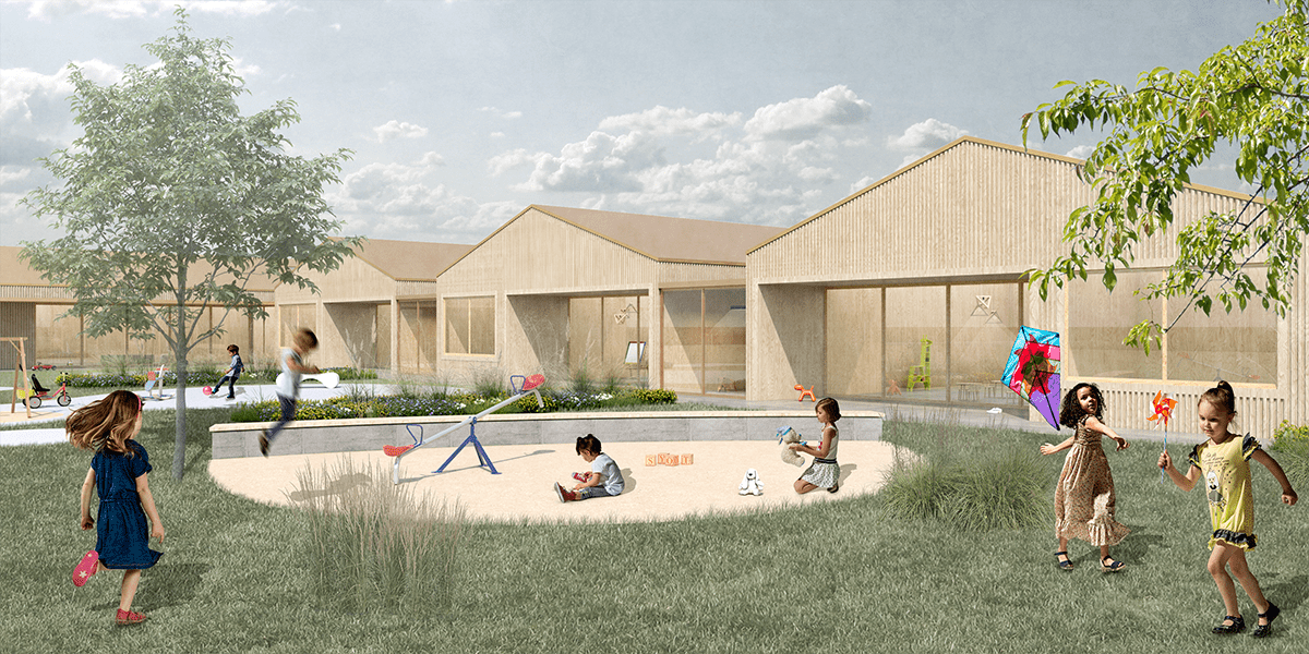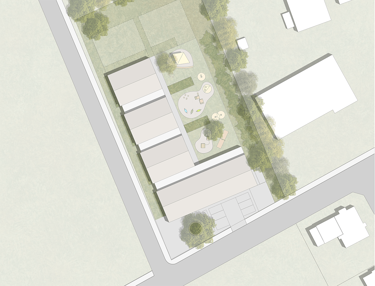 Am Rande des Ortkerns von Hahndorf planen wir eine Kita mit 3 Gruppenräumen in reiner Holzbauweise.