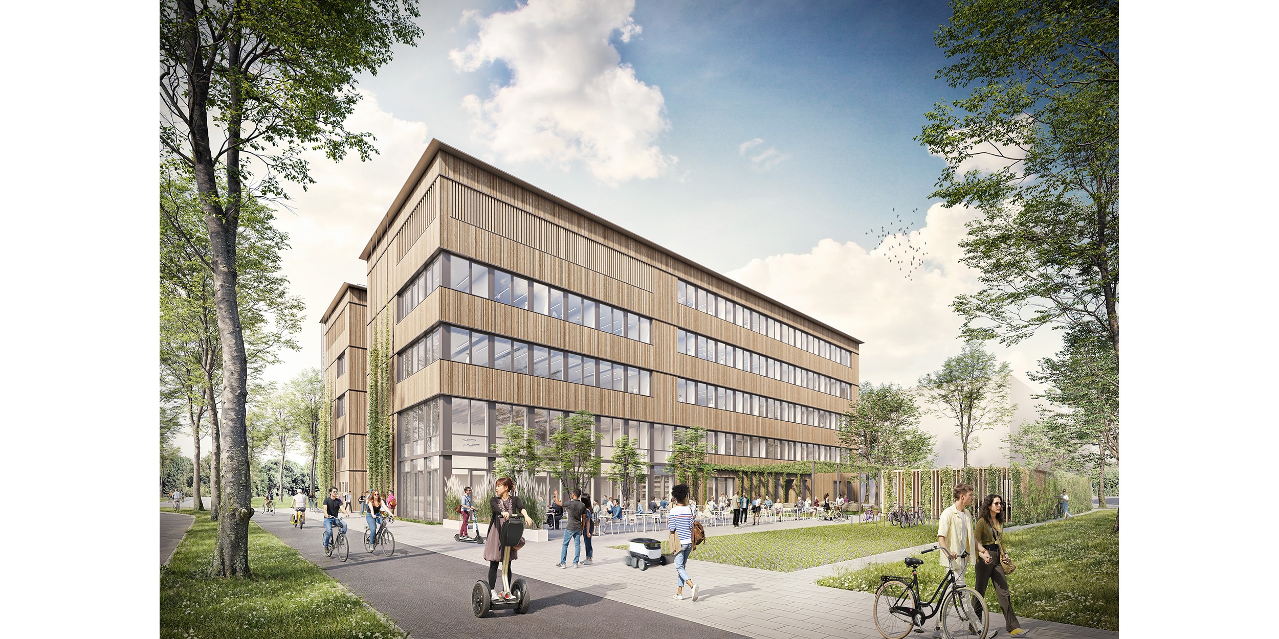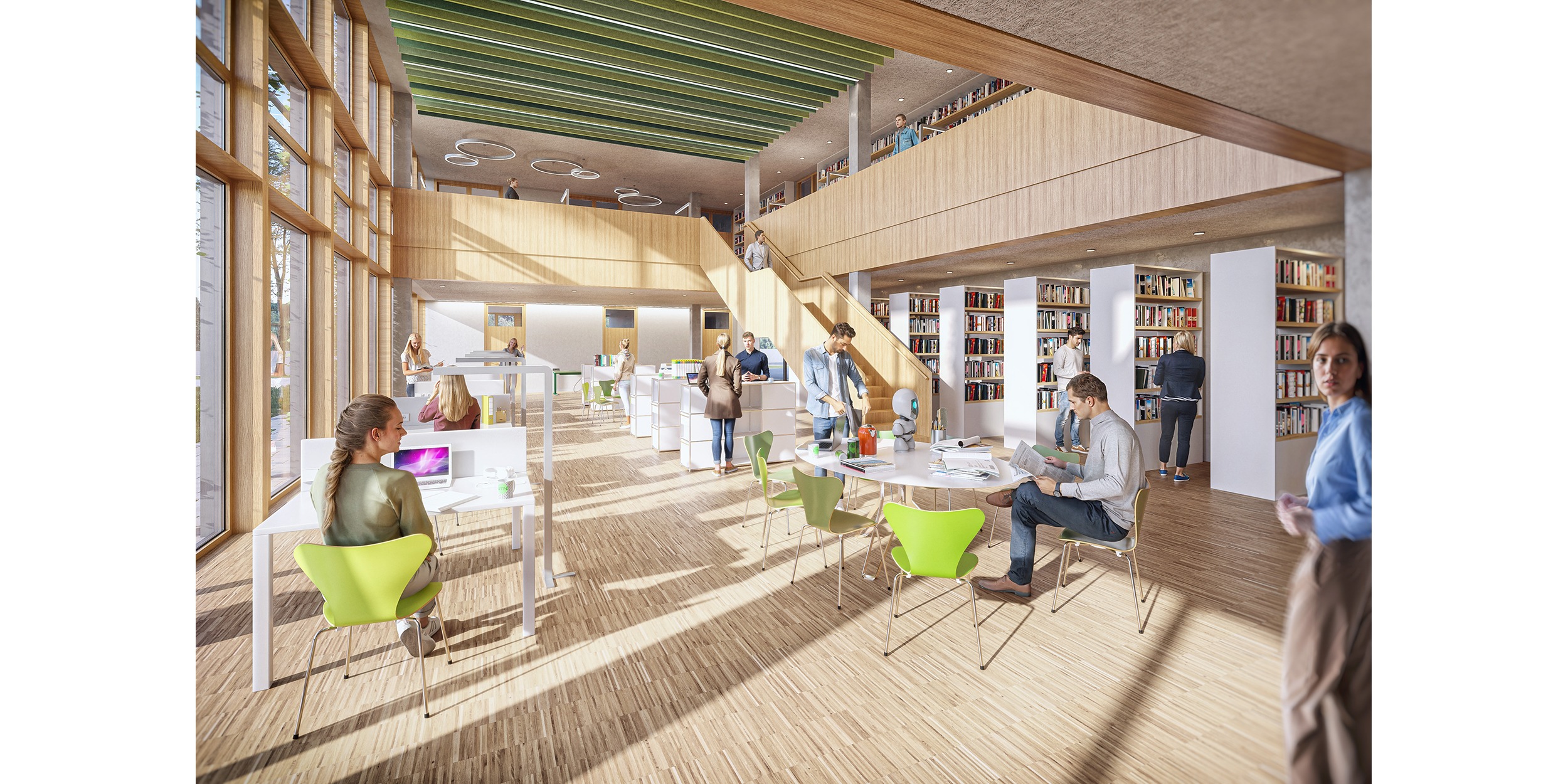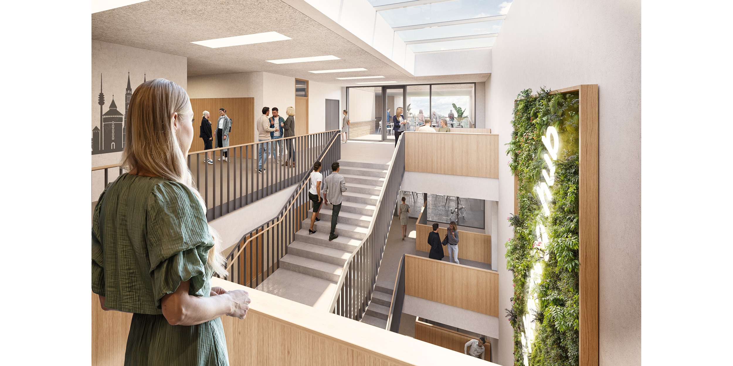 Der Entwurf des Learning Hub interpretiert das städtebauliche Masterkonzept konsequent weiter und fügt sich präzise in das ausgewiesene Baufeld ein. Aufbau und Erschließung orientieren sich an der zugrunde liegenden Machbarkeitsstudie: Zwei klar definierte, fünfgeschossige Riegel stehen senkrecht zur Dr.-Luise-Herzberg-Straße und werden durch eine zentrale, transparente Halle verbunden. Diese gläserne Fuge bildet das Herzstück des Gebäudes. Sie organisiert die innere Erschließung und markiert zugleich zwei gleichwertige, einladende Eingänge, die sowohl eine Anbindung an die Dr.-Luise-Herzberg-Straße im Süden als auch an den zukünftigen Campus-Hauptzugang im Norden schaffen.