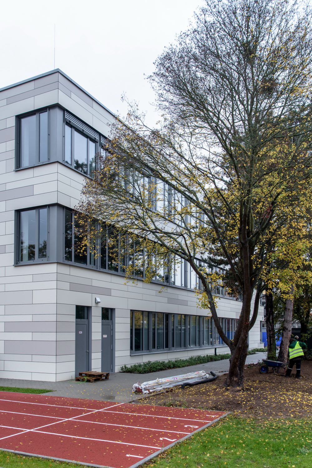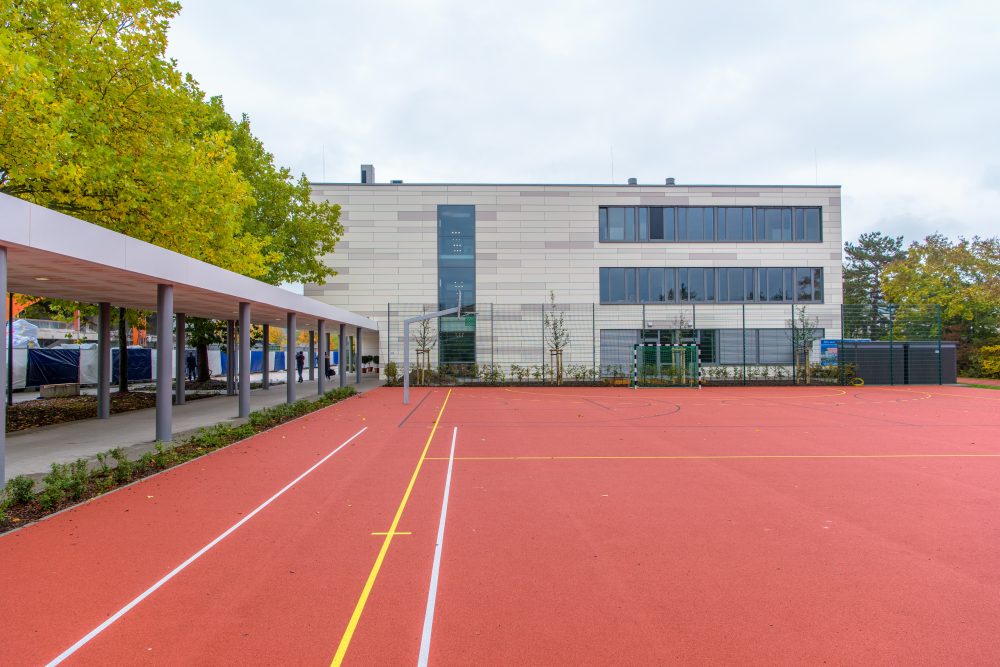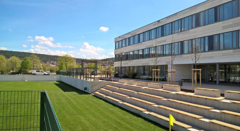 Das Ziel, mit einer möglichst einfachen Form das komplexes Programm aus Schulbau, Sporthalle und schulischen Freiflächen zu gestalten, bestimmt das Konzept für die Schule. Das großmaßstäbliche dreigeschossige Gebäude ist eindeutig und zugleich respektvoll im weiträumigen Landschaftsraum positioniert.
