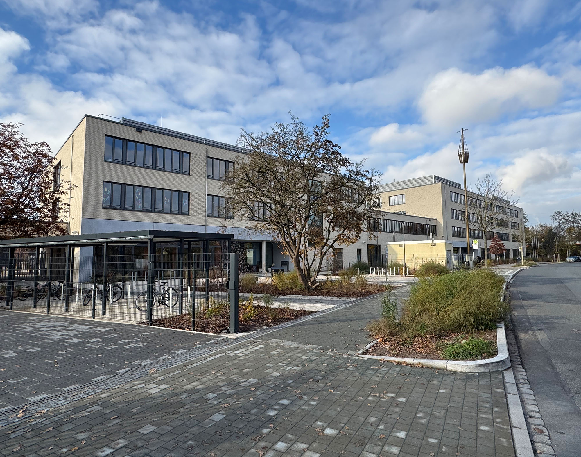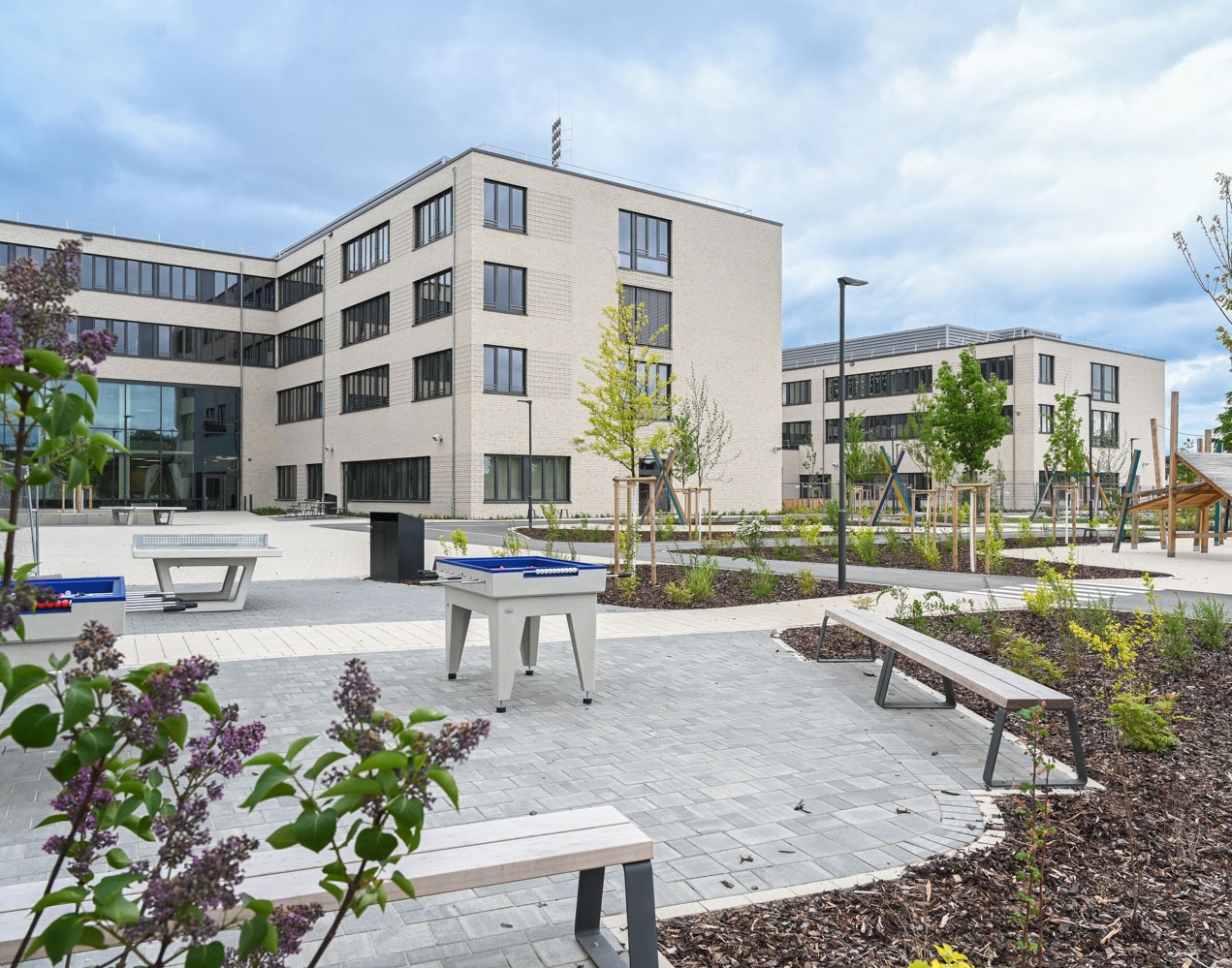 In der Maiacher Straße entsteht auf dem 54.742 qm großen Areal ein Schulcampus für 1100 Schüler:innen mit zwei funktional eigenständigen Gebäudeeinheiten, die