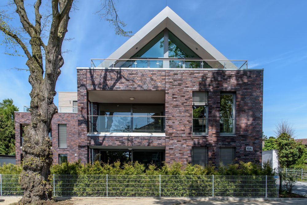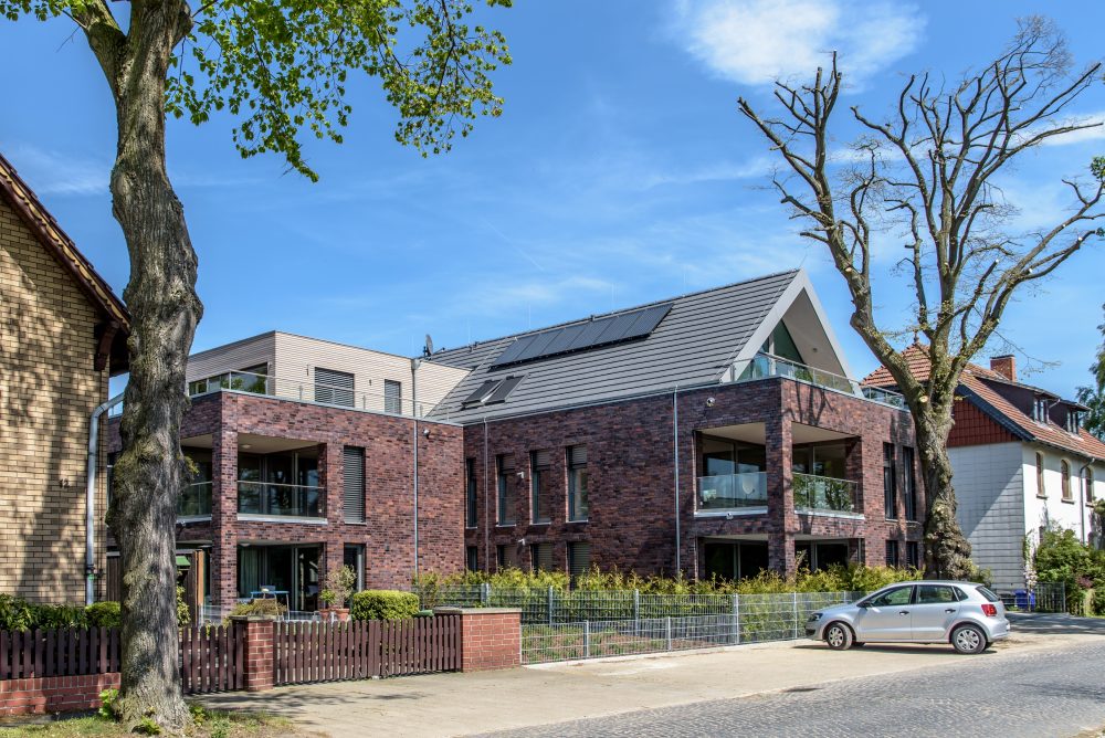 Dass sich das neue Mehrfamilienhaus behutsam in das Bild des historischen Dorfes einfügt, war für die Architekten eine wichtige Rahmenbedingung. Die Diskussion um Authentizität und die Atmosphäre des Ortes nahm daher während des gesamten Entwurfsprozesses eine zentrale Position ein. Unter diesen Rahmenbedingungen entstand eine Reihe unterschiedlicher Wohnungstypologien zwischen 100 und 120 m², die auf klaren architektonischen Grundprinzipien beruhen: ein homogenes Fassadenmaterial aus rotbraunen Backsteinen, einem wiederkehrenden Rhythmus der Fassaden aus tief zurückliegenden bodentiefen, dreifach verglasten Fenstern und weiten Loggien, die wie Mauerwerksnischen, die Wohnungen zueinander in Bezug setzen sowie eine äußerst präzise Detaillierung. Die Wärmedämmeigenschaften der Gebäudehülle übersteigen die aktuellen Anforderungen und zur Unterstützung der Warmwasseraufbereitung sind dezent platzierte Solarmodule auf den Dächern untergebracht. Alle Wohnungen sind über einen Fahrstuhl erreichbar. Entscheidend bei den Grundrissen war ein offenes und fließendes Raumbild zwischen Küche und Wohnraum, dazu ein dezenter Farb- und Materialdualismus zwischen hellen Farben und warmen Holztönen.